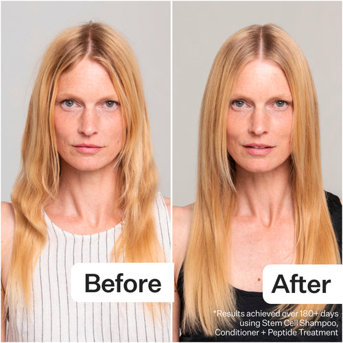 Use the Stem Cell Shampoo + Conditioner for each cleanse, followed by the 3% Stem Cell Peptide Treatment daily.